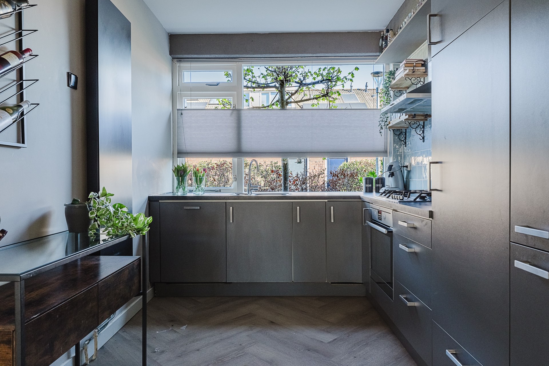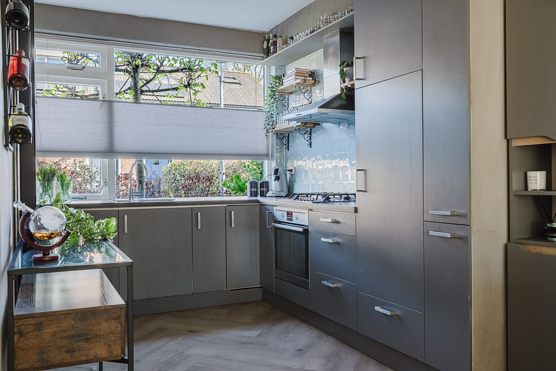 De L-vormige open keuken is gelegen aan de voorzijde van de woning en kijkt uit over de voortuin, een trottoir en gemeentelijk groen. De keuken is voorzien van een vaatwasser, spoelbak, 4 pits gaskookplaat, afzuigkap, oven en een koelkast met vriesvak.
