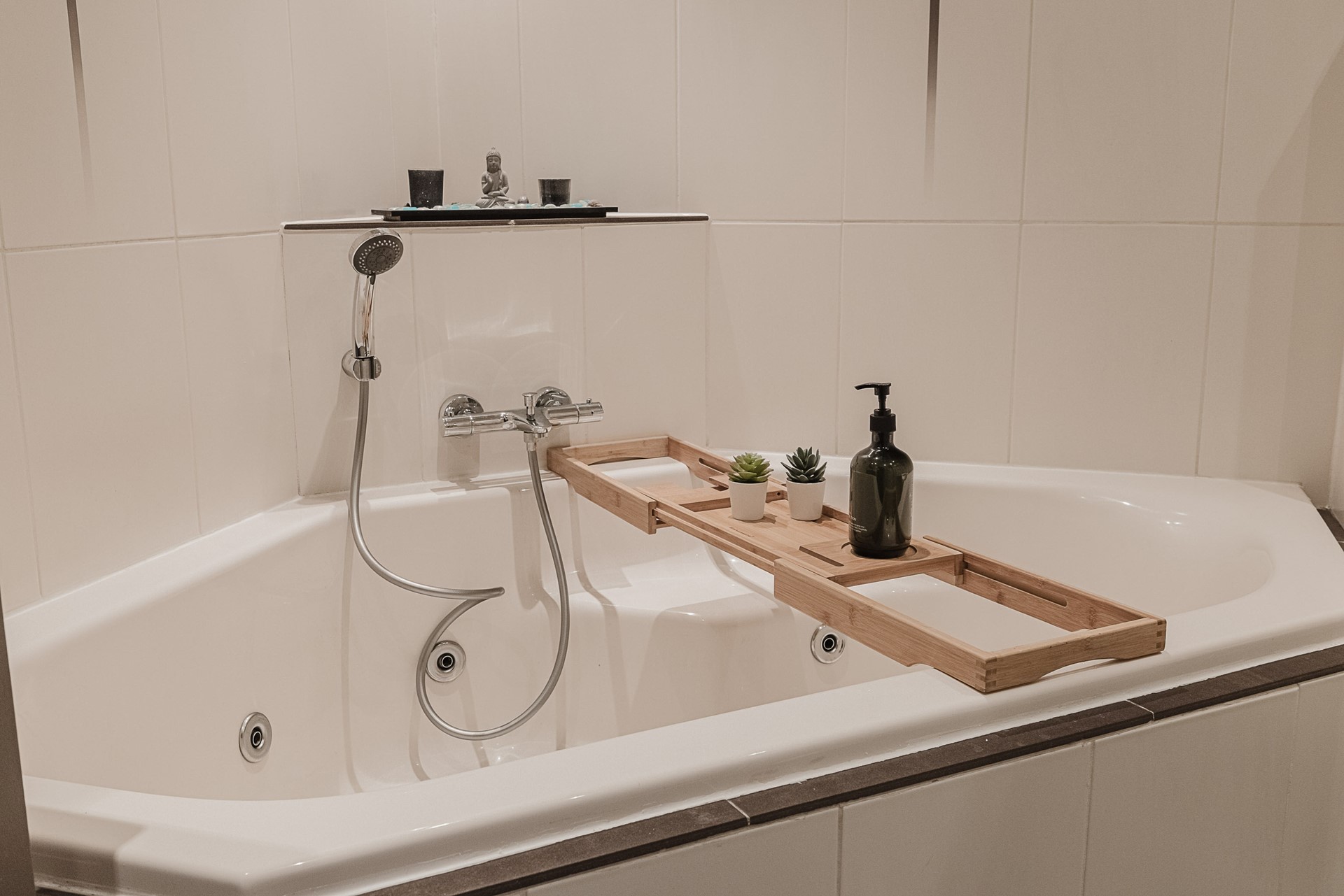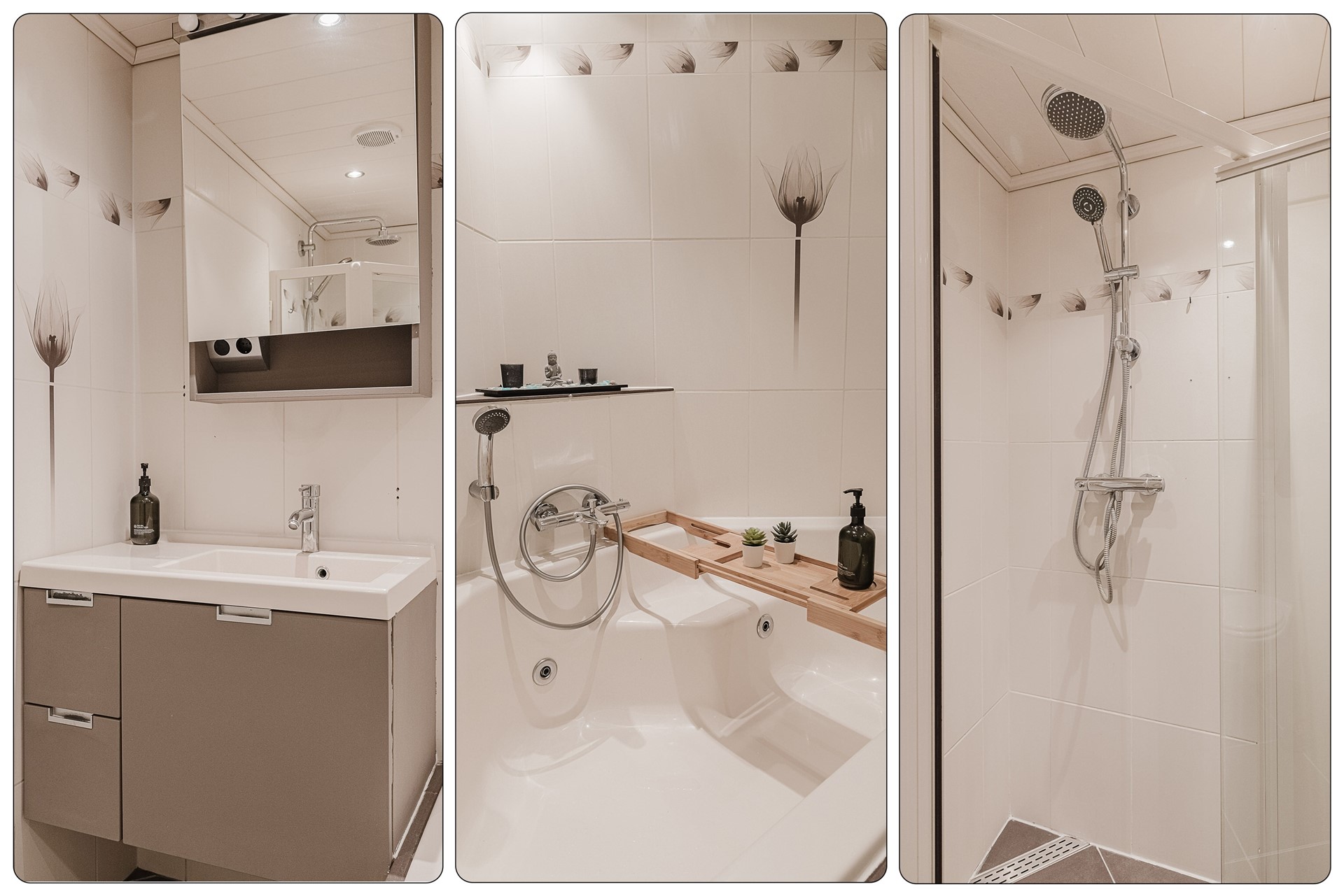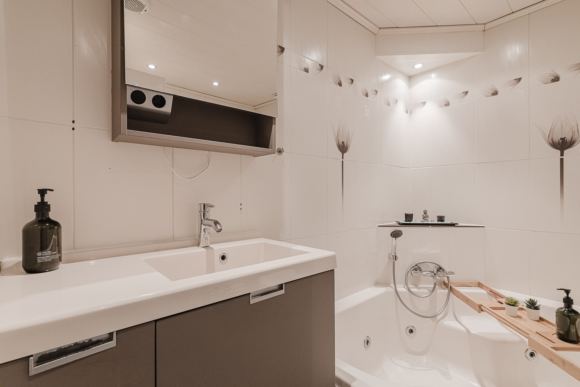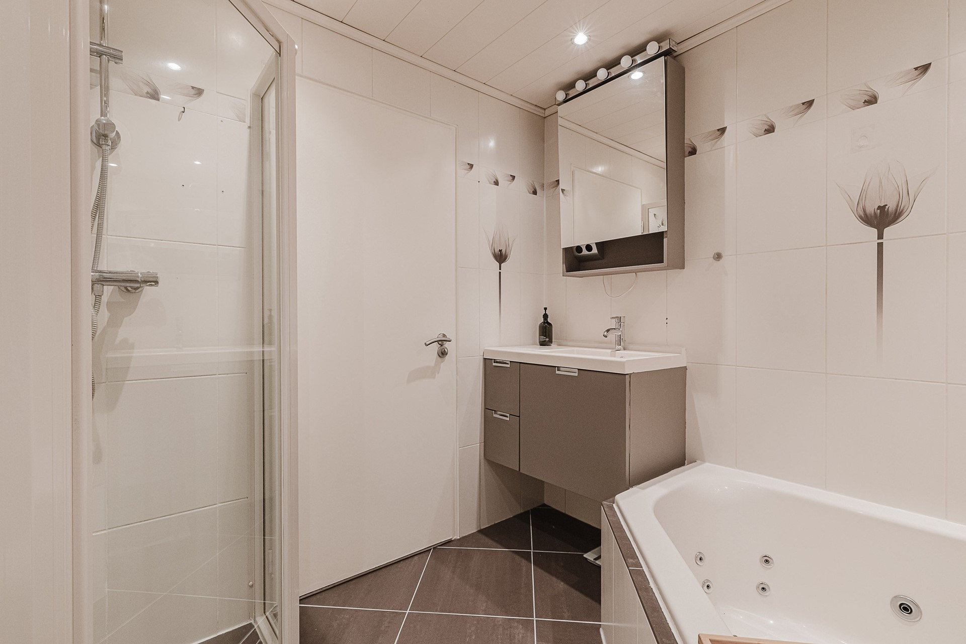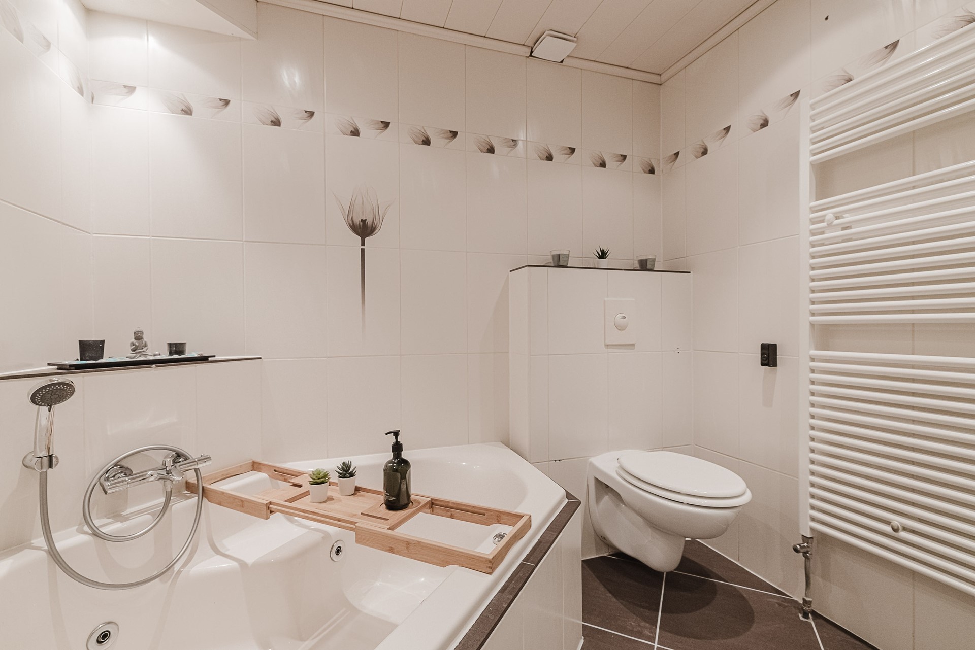 De badkamer is voorzien van een wastafelmeubel, ligbad met thermostatische kraan, douche met stortdouche en thermostatische kraan, wandcloset en design radiator.