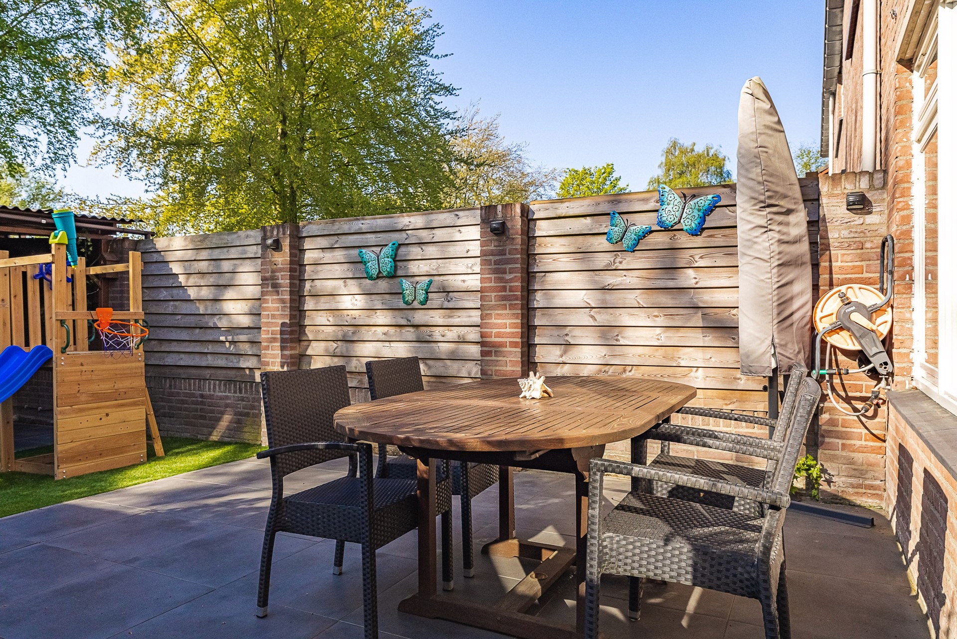 De tuin is gesitueerd op het zonnige zuiden en is fraai aangelegd met plantenborders, kunstgras en een groot terras. Er is ook een buitenkraantje aanwezig. Achterin de tuin bevindt zich de overkapping, een heerlijke plek om de warme zomeravonden door te brengen!